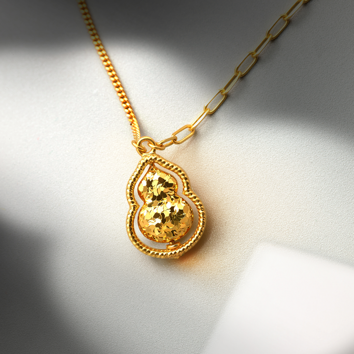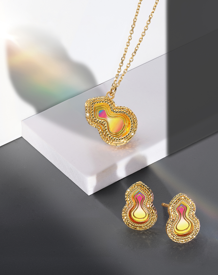 将传统的吉祥葫芦元素和现代的设计理念相融合,汲取“福禄”寓意,彰显摩登格调。运用车花工艺层层精饰,以绮丽幻彩衬底,赋予金饰独特的彩虹般的渐变色彩,呈现出光影交错的视觉效果。外圈多层麻花绳纹围边,寄语绳绳相继,祈求子孙平安繁盛。精湛的工艺让金饰充满了艺术气息,每一次摇晃都闪着熠彩光芒。“炫彩葫芦”不仅是一种时尚的选择,更是对美好生活的向往和祝福。