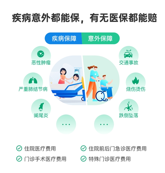 长相安2.0长期医疗险在疾病保障方面同样表现出色,多种保险金将为恶性肿瘤、严重肺结节病、阑尾炎等疾病提供保障;同时长相安2.0也为交通事故、烧伤烫伤等意外情况设置了住院医疗费用、住院前后门急诊医疗费用、门诊手术医疗费用、特殊门诊医疗费用等保障。无论您有无医保,长相安2.0均为患者提供了坚实的后盾。