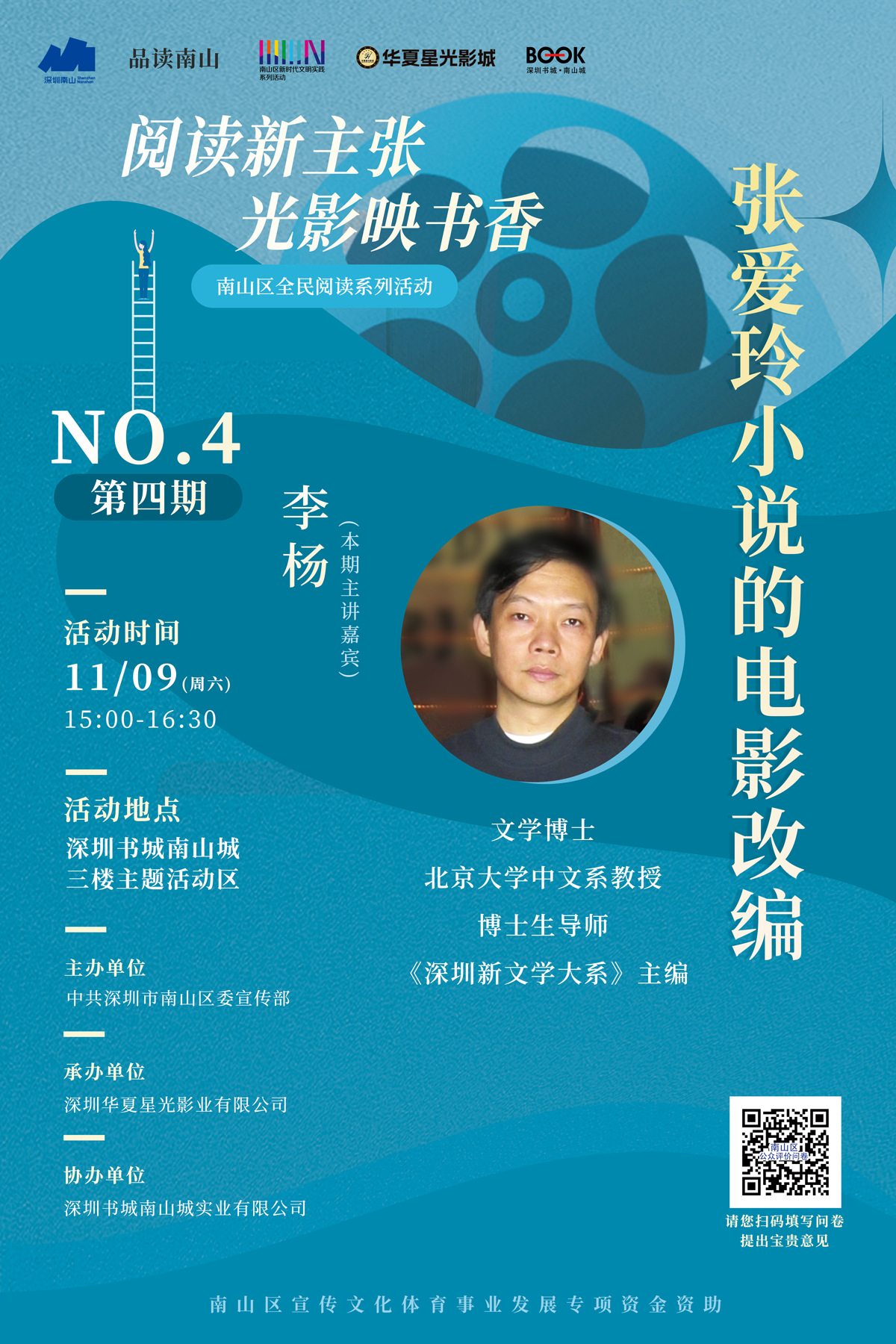 11月9日下午三点,由中共深圳市南山区委宣传部主办,深圳华夏星光影业有限公司承办的第四期“阅读新主张 光影映书香”南山区全民阅读系列活动将在深圳书城南山城3楼活动区举办。北京大学中文系教授李杨将以“张爱玲小说的电影改编”为主题,比较分析如《倾城之恋》《半生缘》《色戒》《第一炉香》等张爱玲重要作品的电影改编,比较文学与电影、文字艺术与影视艺术的差异。深圳市政协文化文史委主任尹昌龙也将做客现场,与李杨教授来一场精彩对谈。