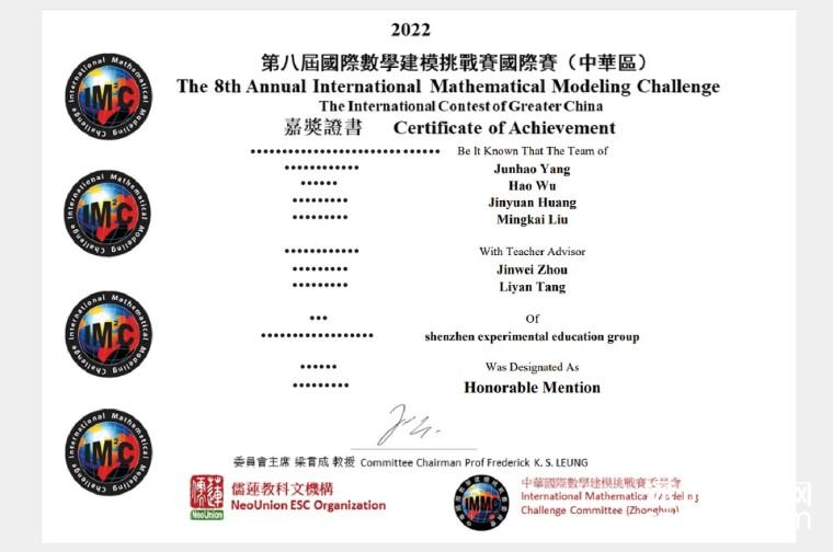 ▲桃李未来数学培优集训队指导深圳实验初中学生获得IMMC 国际数学建模挑战赛特等奖。
