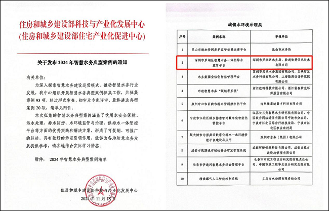 智慧水务不仅是民生工程的关键一环,也是智慧城市构建中不可或缺的重要组成部分。为深入挖掘智慧水务的建设与运营模式,推动行业的蓬勃发展,住建部科技与产业化发展中心启动了“2024年度智慧水务典型案例”的征集活动。近日,国内众多知名水务公司、设计院、水务集团、排水公司等企事业单位群雄逐鹿,经过层层严格筛选与评审,软通智慧联合罗湖区水务局联合申报的深圳市罗湖区智慧水务一体化综合管控平台,从征集到的近百项成果中脱颖而出,成功入选城镇水环境治理类典型案例。