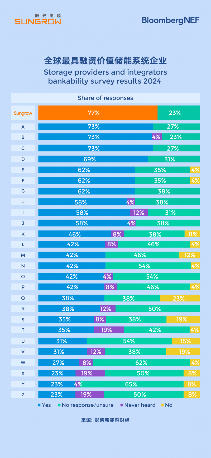 BloombergNEF是全球最具权威的第三方研究机构之一,其报告长期以来是金融机构在商业信贷决策中的重要依据。被BloombergNEF评为最具融资价值品牌,有助于客户进行项目融资,让项目更具竞争力,降低投资风险。本次报告中,超过80%的受访对象是总部位于欧美的国际性客户,这充分展示了全球客户及金融市场对阳光电源品牌的信任。