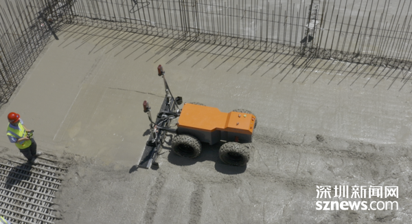在项目大底板混凝土浇筑过程中,项目团队运用四轮激光地面整平机器人“大显身手”,通过电机驱动平台,使其自主运行施工作业,激光扫平精度达到5毫米,以最小的对地压强,实现无痕施工,确保了地面平整度达到最佳状态,与传统工艺相比,使用智能建筑机器人施工的方法具有施工效率高、精度高和绿色低碳等多重优势。