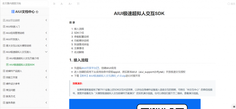 在AIUI开放平台的文档中心,在目录中选择“AIUI极速超拟人交互接入”后,可下载到开源接入SDK的代码压缩包、接口文档及效果演示视频。