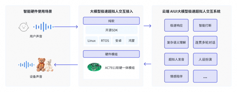 面向低成本、低算力智能硬件设备大模型交互接入难、门槛高的问题,科大讯飞开放了极速超拟人交互接入的代码,极大地降低了硬件接入门槛。它能在低算力、低内存设备上稳定运行,支持ROTS、Linux、安卓、鸿蒙等多种主流操作系统,智能硬件厂商无需投入大量研发资源,即可快速实现设备的智能语音交互功能,推动极速超拟人交互技术的普及和应用。