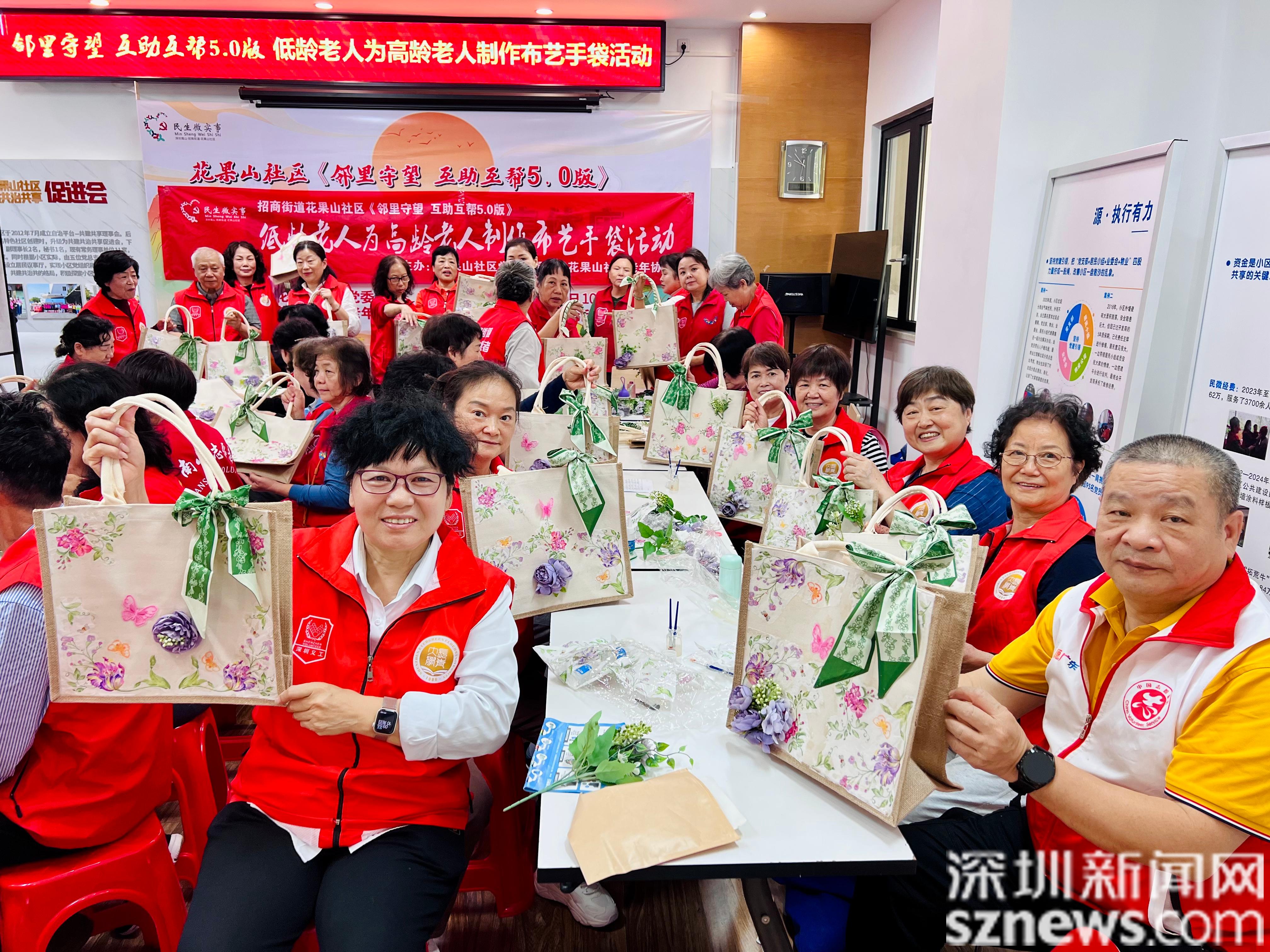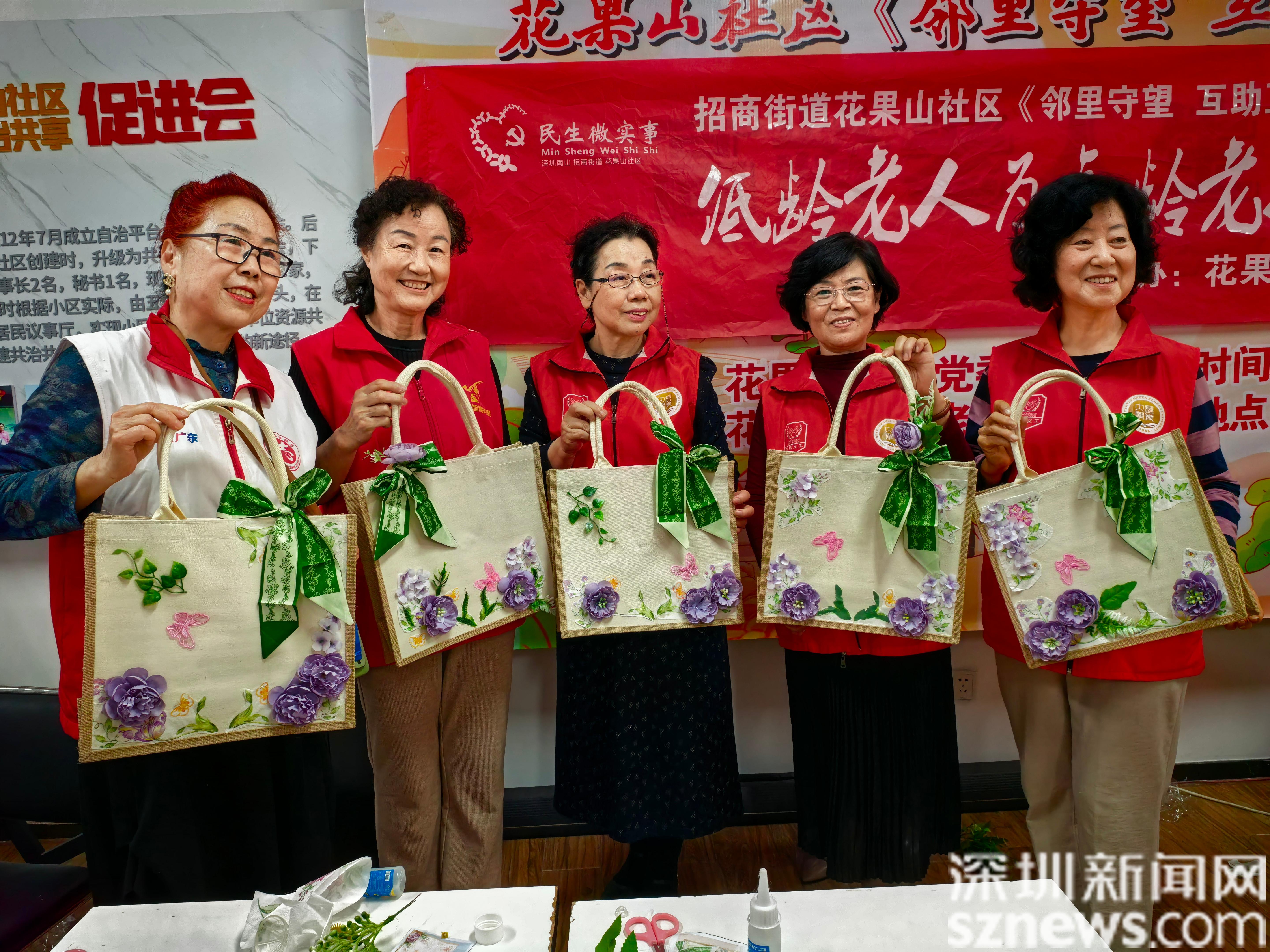 深圳新闻网2025年4月10日讯(记者 董非)4月10日上午,招商街道花果山社区花园城三期党群活动中心喜气洋洋,40名低龄老人志愿者展示亲手制作的布艺手袋,任凭记者拍照。这些美丽精致的手袋是他们用两个半天的时间精心制作而成,将由招商街道花果山社区党委赠予40位高龄老人。至此,由花果山社区党委主办、花果山社区老年协会承办的民生微实事项目——《邻里守望 互助互帮5.0版》圆满结束。