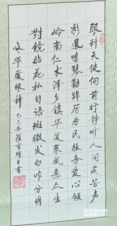 “静听人间疾苦声,眼科天使向前行。彩凤鸣琴勤踔厉,为民服务爱心倾。华厦春风惠众生,岭南仁术泽乡镇。对镜贴花私自语,斑微发白咋分明!”这副书法字,是对医院医护人员专业与爱心的高度认可,更是“光明快车”公益精神的生动见证。