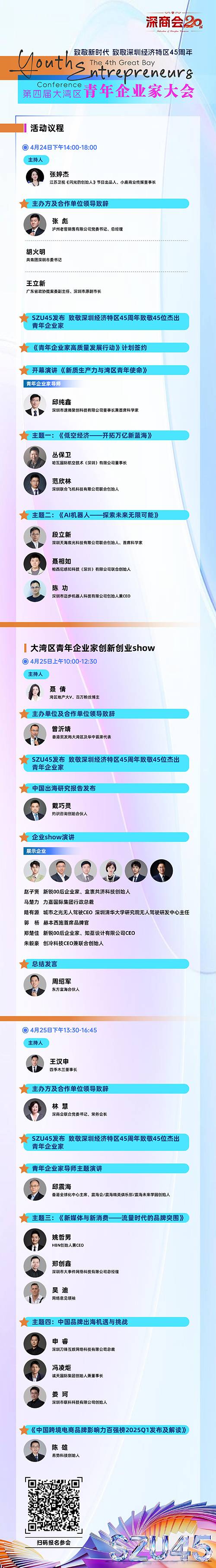 本次大会搭建起青年企业家交流的高端平台。在这里,机器人、人工智能、低空经济、跨境电商、新媒体、新消费等前沿领域将成为热议的焦点,激发青年企业家的创新活力,助力湾区高质量发展。