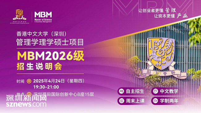 深圳新闻网2025年4月18日讯(记者 董非)香港中文大学(深圳)管理学理学硕士项目(Master of Science in Business Management,简称MBM)秉承“让创业者更懂管理,让资本更懂产业”的课程主旨,坚守与香港中文大学一贯的学术水准,为国家建设、湾区发展培养兼具创新精神、前瞻性思维和国际视野的复合型管理人才。MBM2026级第一批次招生正式启动,申请截止为2025年6月19日(星期四)。