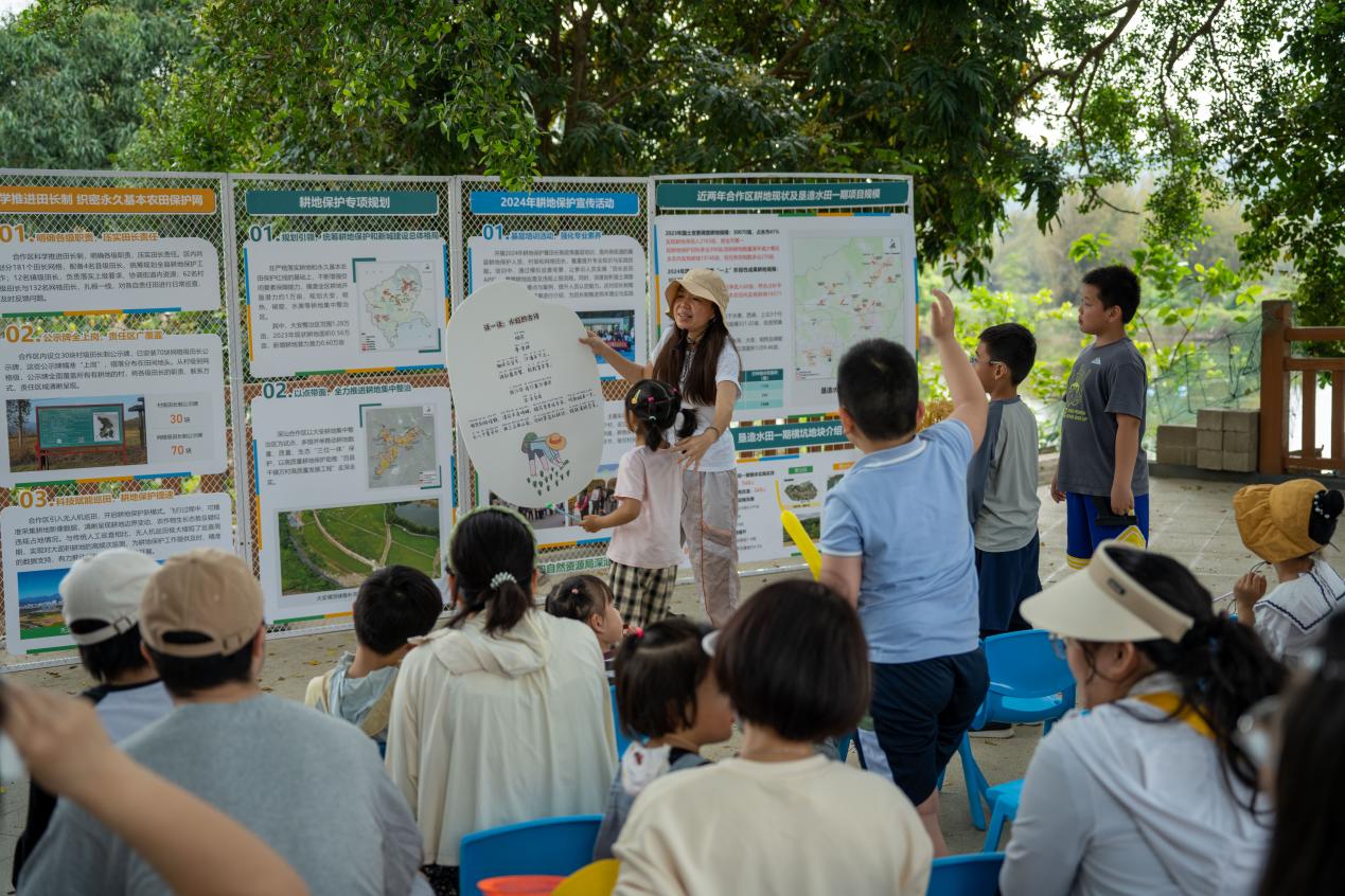 “新里村这片梯田已有300年历史,每寸耕地都是先辈们向大自然申请的‘生态契约’。”在绿树成荫的大树下,讲解员从深汕特别合作区耕地实际情况引入,结合生动的图片为孩子们讲述水稻的故事,让大家了解到每一粒粮食的来之不易,以及耕地保护对保障粮食安全、维护生态平衡的重要意义。随着讲解员的脚步,亲子家庭来到科普展板前。讲解员将耕地保护红线、永久基本农田保护、“藏粮于地”战略等政策话语,转化为孩子们听得懂的有趣语言。孩子们听得聚精会神,不时提出各种问题。