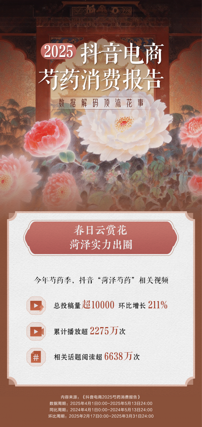 作为中国的芍药之乡,菏泽年产芍药鲜切花超1.2亿枝。4月中旬,罕见大风和寒潮席卷山东,五万亩菏泽芍药花田面临“生死大考”。暮春之际,在抖音电商平台邀约下,各地花卉商家奔赴花海,在花田里架起直播间,助力菏泽芍药销售,让穿越千年的春日限定美走进千家万户。报告显示,今年芍药季,有超4500名抖音电商创作者为菏泽芍药“打call”。