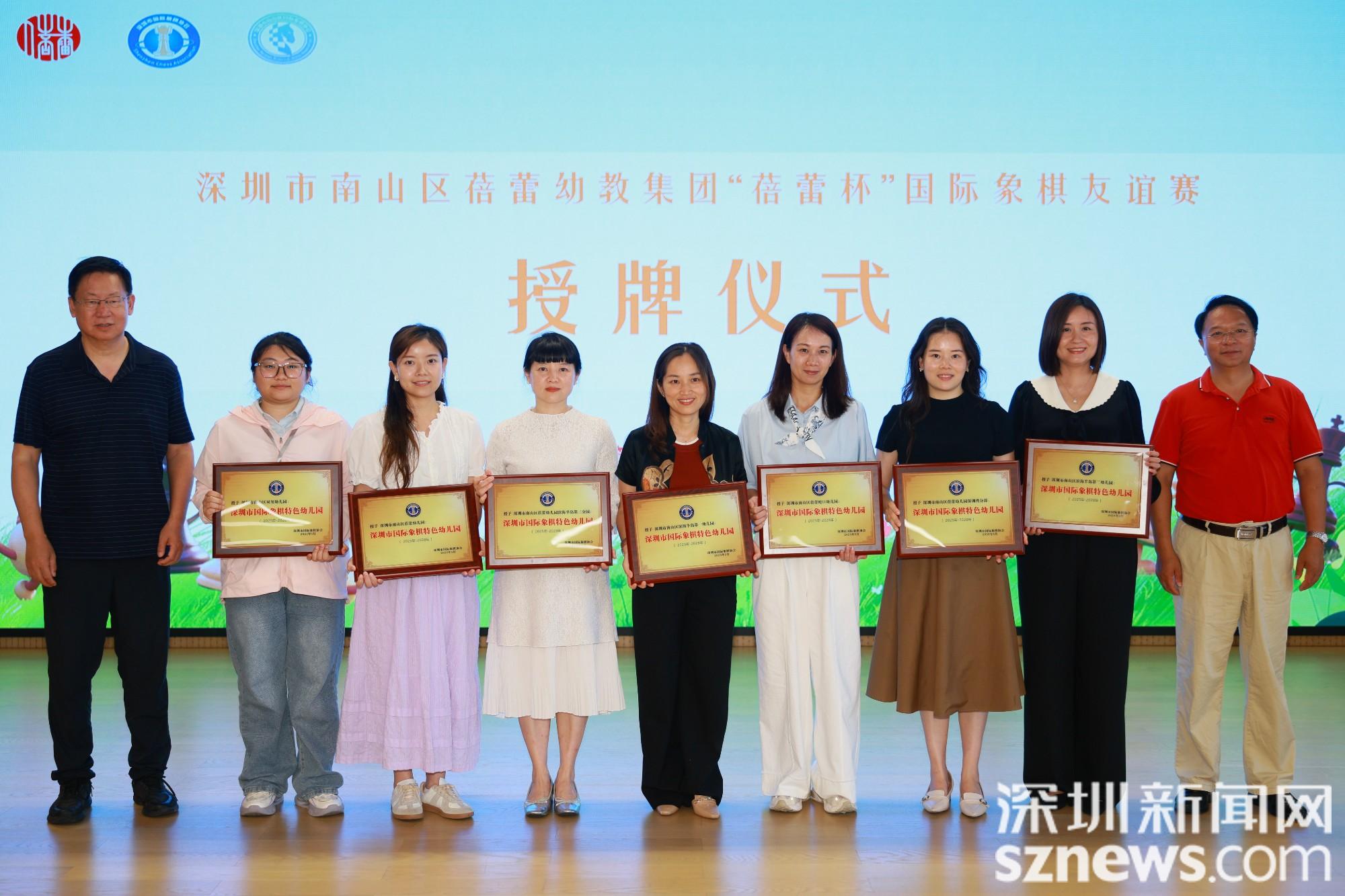 活动中,深圳市特聘国际象棋专家教练员、国际特级大师叶江川,南山区教育局原党组成员、主任督学洪其华,深圳市南山区蓓蕾幼教集团总园长余幼平等嘉宾,为集团7所幼儿园授予“深圳市国际象棋特色幼儿园”牌匾,以表彰幼儿园在国际象棋幼儿教育领域的创新探索与卓越成果。随后,集团各幼儿园副园长为荣获金奖的小棋手颁发奖杯与奖牌。
