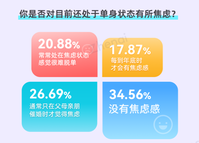 此前,珍爱网发布的调研数据显示,当青年被问及对目前还处于单身状态是否有所焦虑时,20.88%的人表示常常处在焦虑状态,感觉脱单困难;有17.87%的人每到年底时会有焦虑感;26.69%的人通常只在父母亲朋催婚时才觉得焦虑;另仅有三成人(34.56%)表示并没有焦虑感。