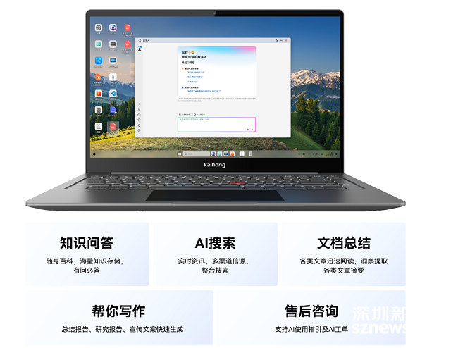 开鸿Bot产品搭载原生AI助手,支持键盘一键唤醒,具备文档总结、知识问答、AI搜索等功能,协助开发者提升效率。配合国产OS与芯片方案,产品采用安全域隔离、出域加密等机制保障数据安全,并提供持续OTA系统更新服务,保障系统稳定性和安全性。
