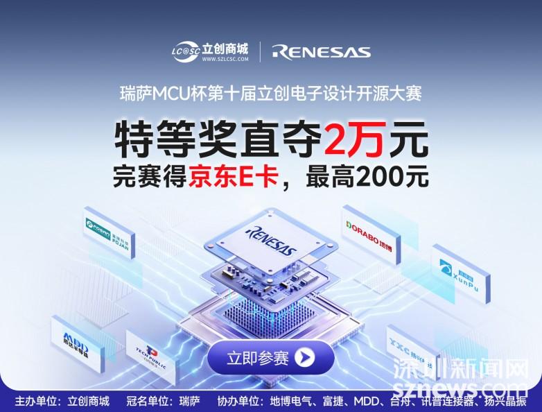 深圳新闻网2025年5月22日讯(记者 董非)十年淬炼,荣耀再启。5月20日,“瑞萨MCU杯”第十届立创电子设计开源大赛(DIY.SZLCSC.COM )开幕。大赛福利全面升级,最高2万现金大奖虚位以待,完赛得京东E卡,最高200元!