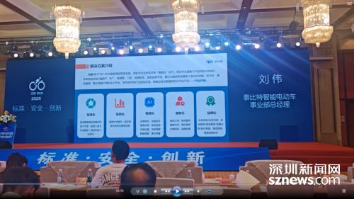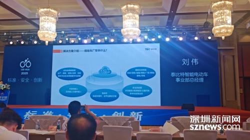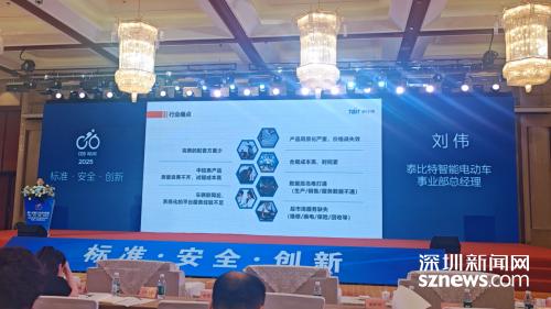 会议上江苏省工信厅领导马小平发表了开场致辞,在这场行业思想碰撞的盛宴中,深圳市泰比特物联技术有限公司智能电动车事业部总经理刘伟应邀出席,并发表了题为《驭势而行——以55公斤云平台驱动两轮车产业合规升级与智能跃迁》的主题演讲。刘伟以其敏锐的行业洞察力,结合丰富的实践经验,深入阐述了对新国标改革的深刻见解与前瞻思考。