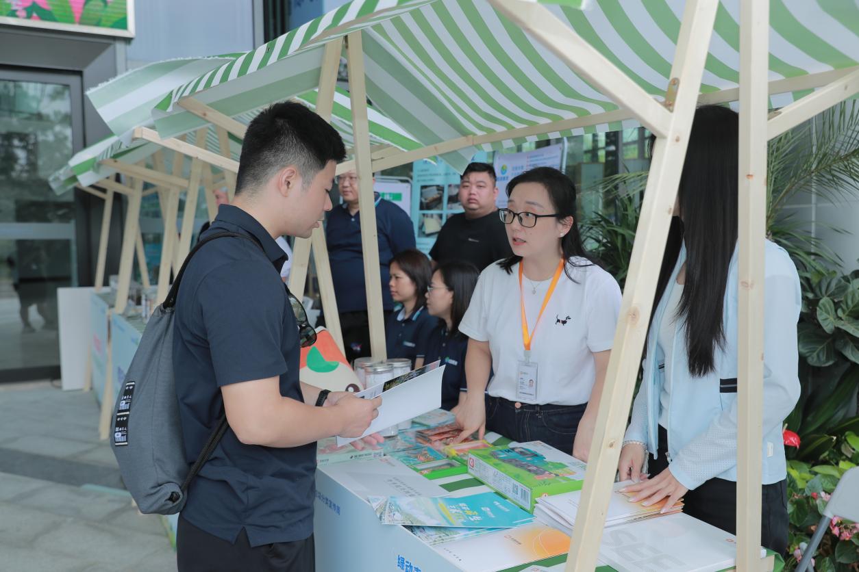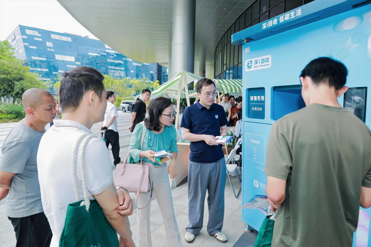 一旁的展示区,各企业带来回收品再生而成的文创产品,如有机肥料、观赏鱼饲料等,让同学们直观感受“变废为宝”的“神奇魔力”。现场同步展示了智能回收箱,工作人员现场演示“深i回收”服务系统及智能回收箱使用方法,同学们纷纷在此驻足体验,感受科技为环保带来的便捷与高效。据介绍,市民可以通过“美丽深圳”微信公众号“便民回收”栏目进入“深i回收”系统,查询回收网点信息,极速定位周边所有可回收点位。