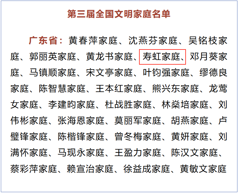 深圳新闻网2025年5月29日讯(记者 曾小苑)近日,中央宣传思想文化工作领导小组发布《关于认定命名第七届全国文明城市、文明村镇、文明单位和第三届全国文明家庭、文明校园的决定》,决定授予尚丽新家庭等798户家庭全国文明家庭称号。其中,南山寿虹、孙莉莉家庭入选!