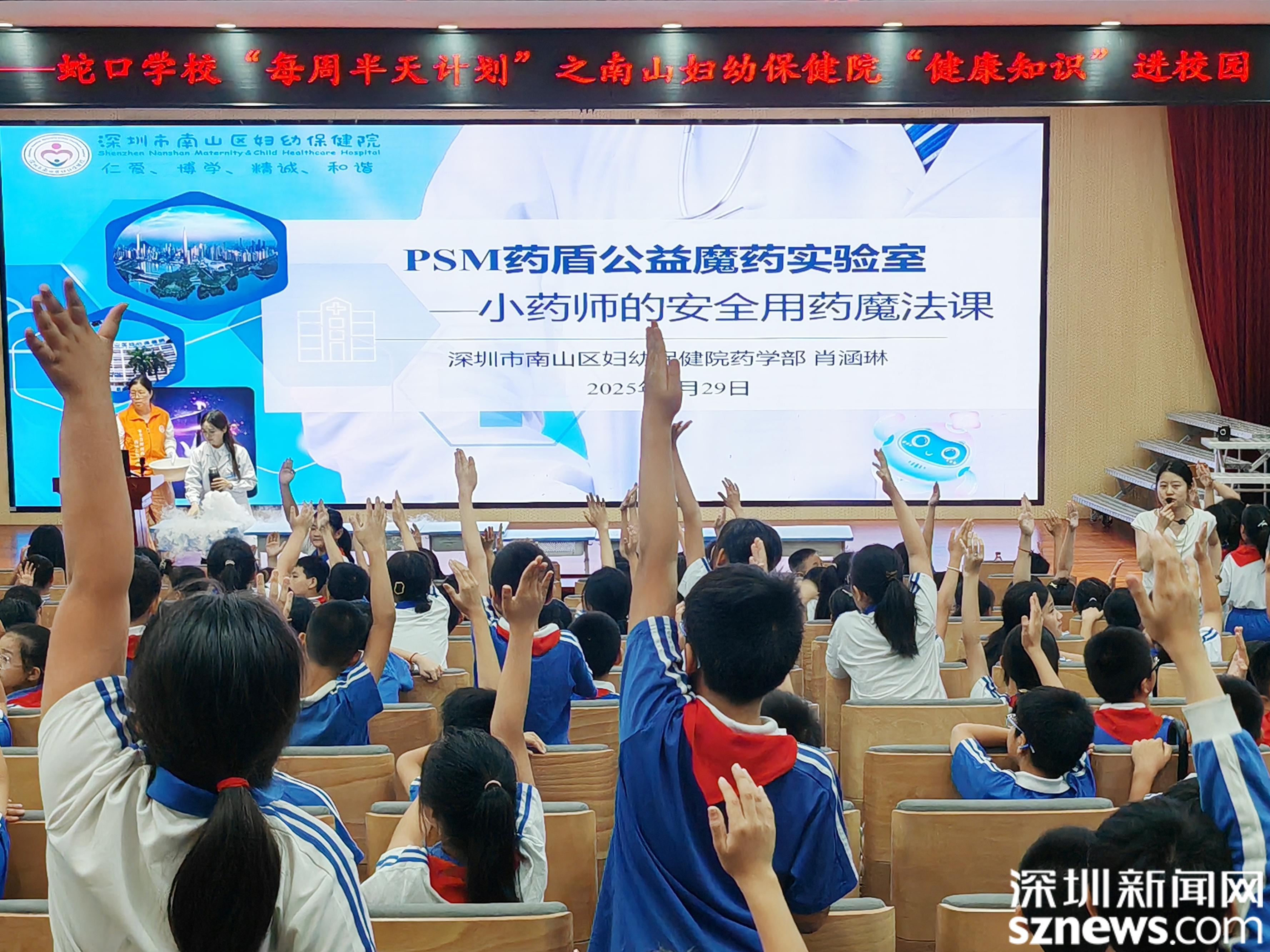 深圳新闻网2025年6月5日讯(记者 董非 通讯员 肖涵琳)当干冰蒸腾的云雾漫过讲台,当“变色药水”在孩子们手中绽放奇幻色彩,引起南山区蛇口学校四年级学生极大兴趣。5月29日,来自南山区妇幼保健院药学部的药师团队化身“魔术师”,用浸式科学实验的方式,给孩子们带来了安全用药的启蒙之旅,这也是该院推出的PSM药盾公益魔药实验室走进校园系列活动。