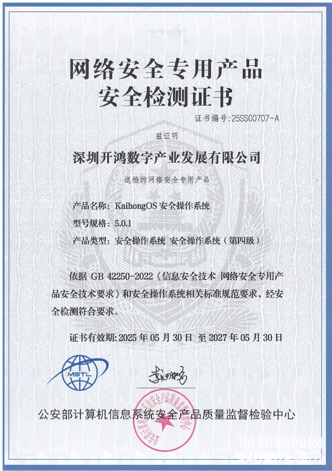深圳新闻网2025年6月6日讯(记者 董非)近日,KaihongOS获得由公安部计算机信息系统安全产品质量监督检测中心颁发的《网络安全专用产品安全检测证书(安全操作系统第四级)》。据介绍,这是继去年通过三级认证后,KaihongOS在安全领域实现的又一重大突破,标志着其成为国内首个、也是目前唯一一个通过公安部最高等级安全认证的开源鸿蒙操作系统发行版,进一步巩固了深开鸿在操作系统与基础软件领域的领先地位。