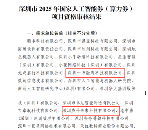 深圳新闻网2025年6月7日讯 (记者 董非) 近日,深圳市发展改革委对人工智能券(算力券)项目资格审核结果予以公示,深圳十方融海科技有限公司及其子公司深圳威科未来有限公司成功跻身58家需求单位之列。这一消息不仅标志着十方融海在人工智能领域的实力获得权威认可,更彰显了深圳在推动人工智能产业发展上的坚定决心与卓越成效。