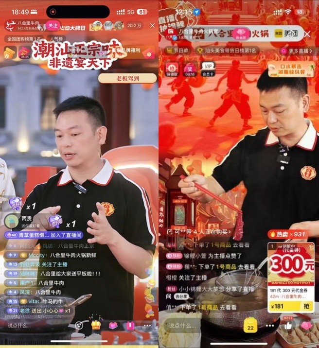 6月6日,八合里牛肉火锅更是将直播间搬进了同期举行的“汕头牛肉活动周”现场。汕头牛肉活动周是由汕头文化广电旅游体育局(文物局)、汕头市市场监督管理局指导,汕头市美食学会、汕头牛肉丸产业联合会、广东省粤东技师学院等单位主办、广东八合里控股有限公司等单位联合主办的一次盛会。八合里牛肉火锅将镜头对准“庖丁解牛”“手打牛肉丸”等比赛现场,将直播间人气推向新高峰。