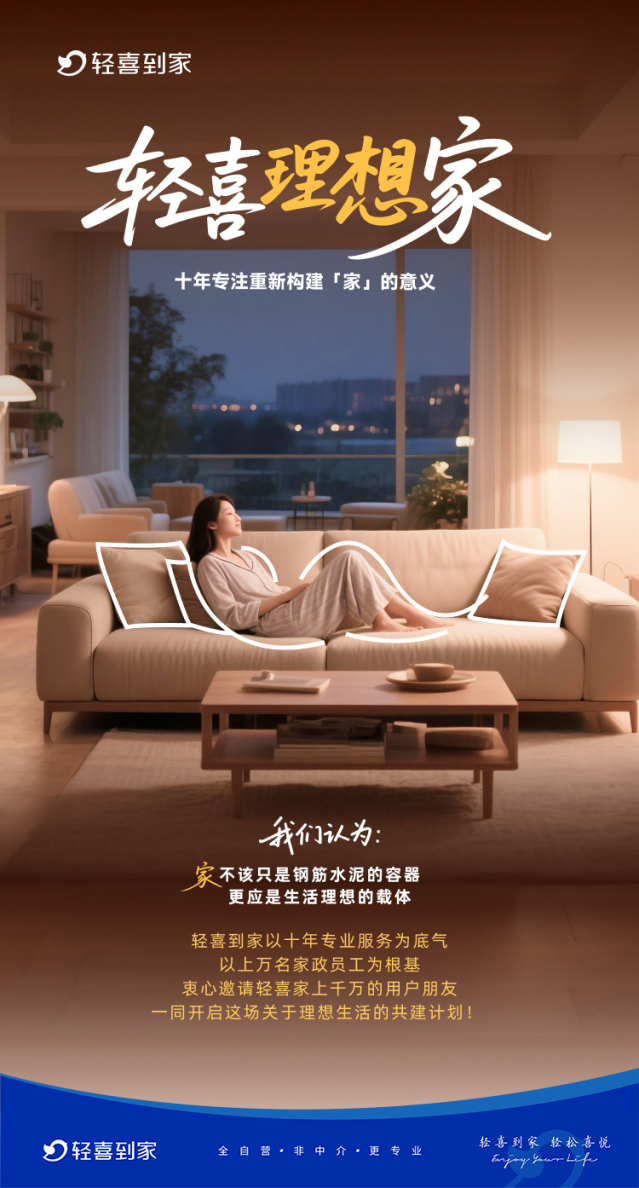 当一年四季无休止的家务琐事占去人们快乐的时光和成长的空间,轻喜到家依托丰富经验积淀与深厚人文关怀,持续释放出最为真诚与温暖的能量,用另一种方式参与构建用户的理想生活:以专业产品守护干净、健康的底层需求,以贴心定制刷新轻松、喜悦的服务体验。在“理想家计划”里,轻喜到家正以家政服务为纽带,让每一次清洁、每一次服务,成为点亮美好生活的仪式感,助力每个平凡的日子都闪耀着品质的光泽。