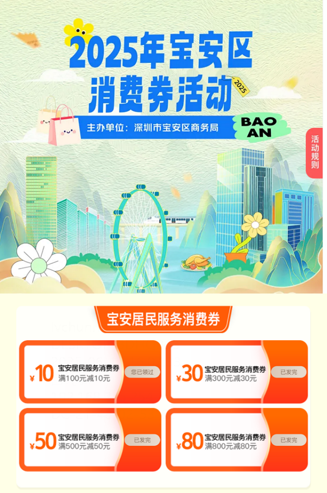 据了解,此次惠民活动由宝安区商务局携手美团、快手联合举办,其初衷在于切实降低市民品质生活成本,并助推消费市场进一步良性循环。6月初至7月中旬间,将在美团及大众点评平台按周发放电子消费券,消费券有效期最长7天,每轮活动中,消费者可领取每种面额的券均1张,用户在平台搜索“宝安区电子消费券”即可进入活动页面领券。