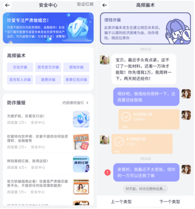 除后台风控与技术护航,珍爱网在用户教育上也下足了功夫。在旗下主打产品珍爱APP中,珍爱网专门设置了“防诈播报”专栏,通过定期推送网络安全提示、恋爱防骗指南、真假红娘辨别方法、常见诈骗套路解读等内容,通过情景模拟帮助用户提高识别力,引导用户科学交友、理性判断、审慎交往,全方位守护真诚相遇的每一步。