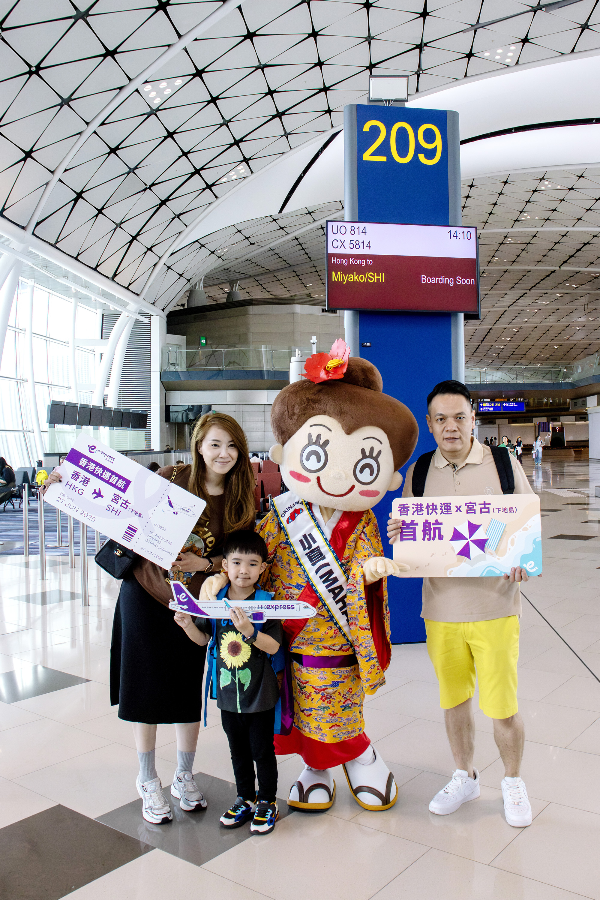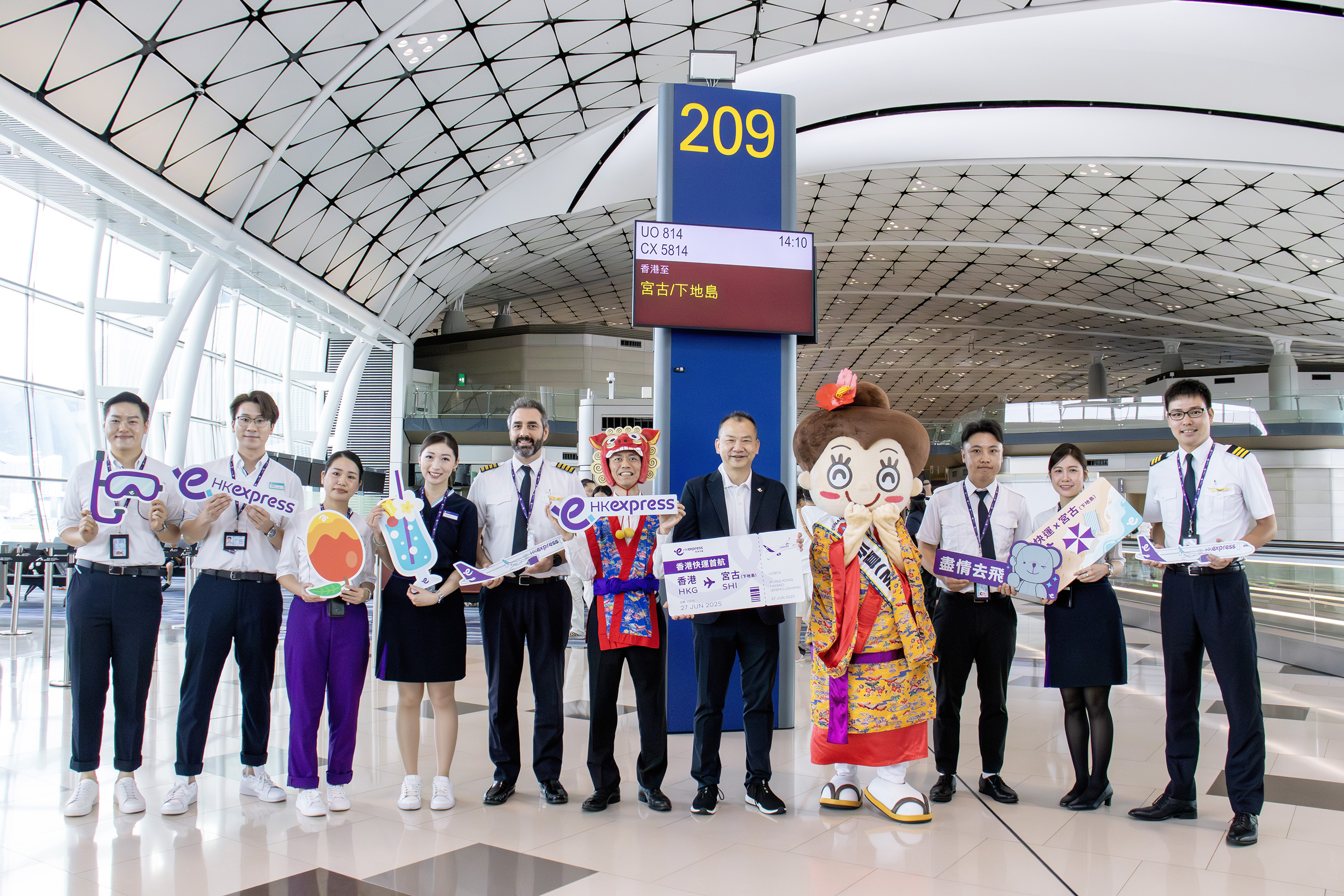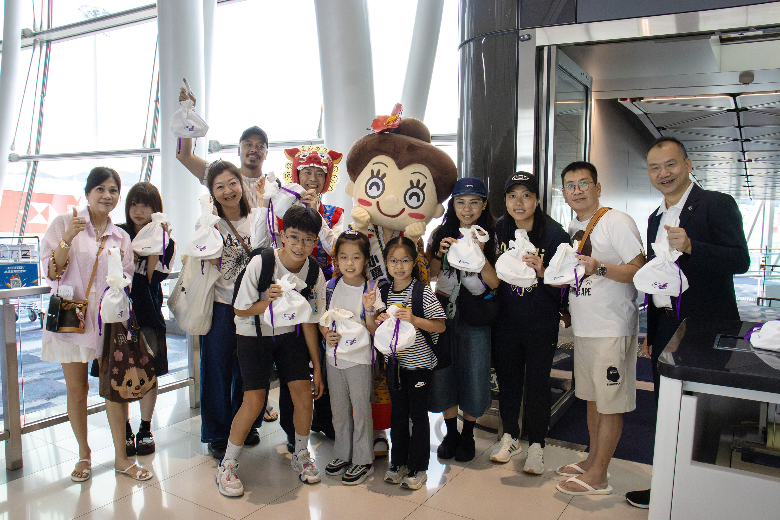 香港快运管理层团队在香港国际机场与旅客合照及派发纪念品,庆祝香港快运日本宫古(下地岛)航线复飞。