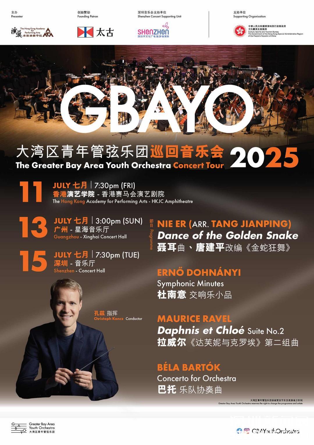 深圳新闻网2025年7月12日讯(记者 董非)大湾区青年管弦乐团(GBAYO)巡回音乐会于去年深受观众欢迎,今年将会再次举办三场巡演。由香港演艺学院筹办、太古集团创始赞助,大湾区青年管弦乐团巡回音乐会凝聚来自香港及大湾区的九十八位年轻乐手,接受有名的指挥及导师的专业培训和指导。今年巡演尾站将于7月15日在深圳音乐厅举行。精选曲目包括聂耳(唐建平改编):《金蛇狂舞》;杜南意:交响乐小品;拉威尔:《达夫尼与克罗埃》第二组曲,以及巴托:乐队协奏曲。