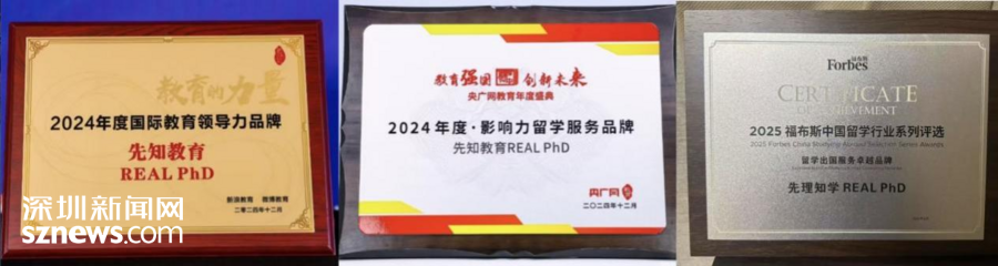 通过不断提高团队的服务能力,先理知学收获学生青睐的同时,还收获了权威机构颁发的多项荣誉:2024年末至2025年初,相继斩获央广网教育“2024年度·影响力留学服务品牌”、新浪&微博教育“2024年度国际教育领导力品牌”奖项;2025年再度荣获福布斯中国颁发的“留学出国服务卓越品牌”奖,这些荣誉也彰显了先理知学在一站式博士留学申请服务领域的卓越实力。