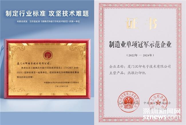 汉印作为《便携式热敏打印机技术规范》团体标准第一起草单位,并荣获2022–2024年度“制造业单项冠军示范企业”。