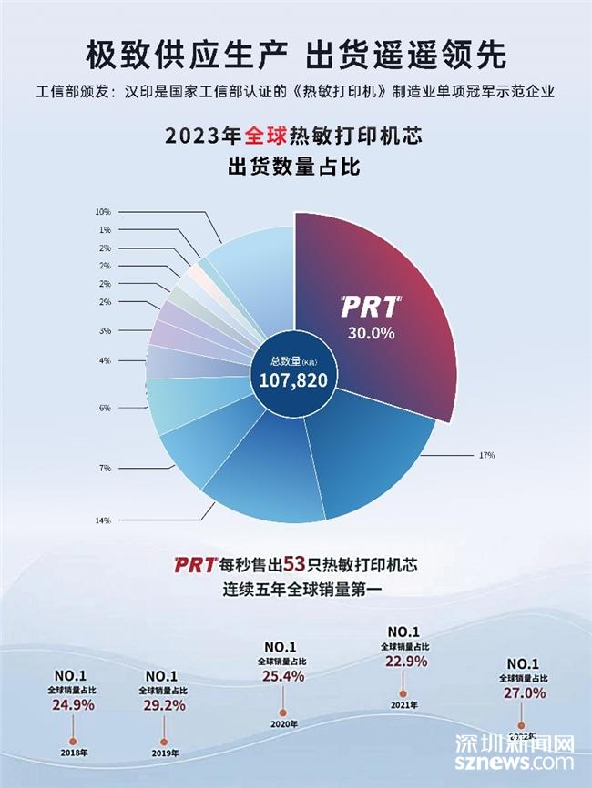 截至2023年的全球热敏打印机芯市场,汉印的出货数量占比高达30%,稳居世界第一。