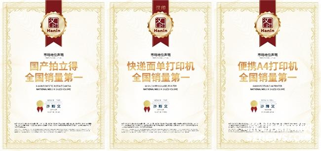 汉印荣获沙利文认证2024年“国产拍立得”“快递面单打印机”“便携A4打印机”三项全国销量第一。