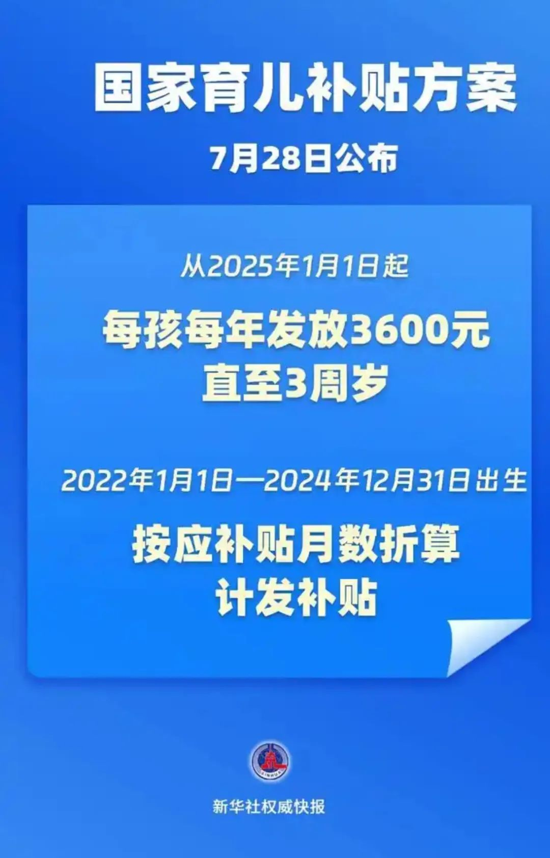 深圳新闻网2025年7月30日讯(记者 董非)7月28日,根据新华社消息,国家育儿补贴制度实施方案正式公布。从2025年1月1日起,对符合法律法规规定生育的3周岁以下婴幼儿发放补贴,至其年满3周岁。育儿补贴按年发放,现阶段国家基础标准为每孩每年3600元。
