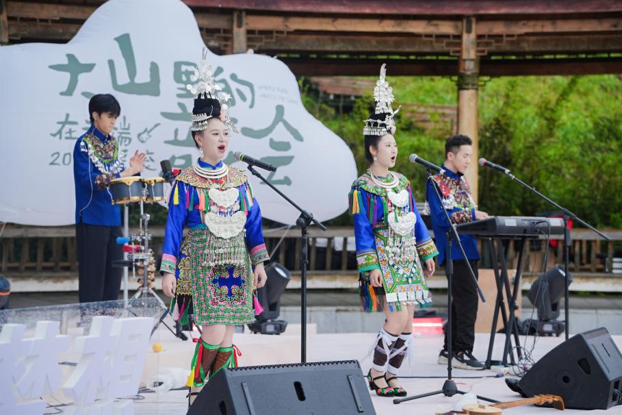 随后,1577乐队以充满乡土气息的创作曲目,将山川大地的故事融入摇滚编曲,让土地的厚重在音符中苏醒;萨玛乐团则以侗族大歌的悠扬和声与传统器乐,让千年民族血脉在现代舞台上焕发新生。台下观众自发拿起音符气球随节奏轻轻摇晃,掌声与欢呼声在山谷中久久回荡。