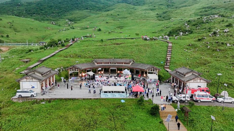 韭菜坪2900米的海拔,赋予了这场音乐会独特的“云端气质”。正值韭菜花微微绽放的季节,碧绿的高山草坪点缀着星星点点的紫色小花,露天舞台坐落在山腰处,与远处的层峦云海相映成趣。