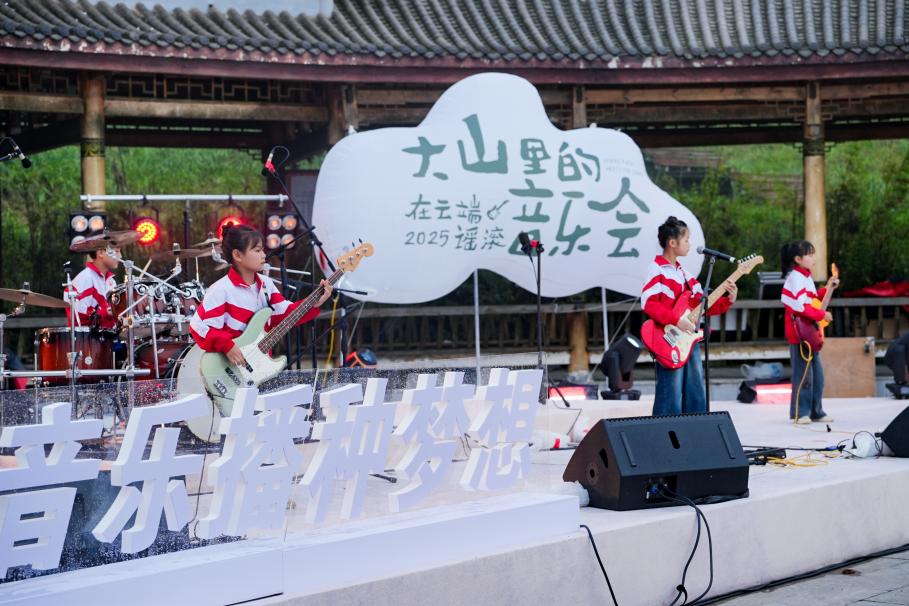 当晚,音乐会以彝族阿奶用树叶吹奏的彝族古老旋律拉开序幕。海嘎少年乐队率先登场——这支来自被誉为“大山里的摇滚学校”的海嘎小学的学生乐队,延续了学校的乐队传承。三年前,“海嘎少年(2022)”乐队曾从山头田野走向央视网络春晚舞台,用音乐凿开了山外的光。如今,“海嘎少年”新生代们清澈嘹亮的嗓音与电吉他的激昂节奏交织,瞬间点燃全场热情。