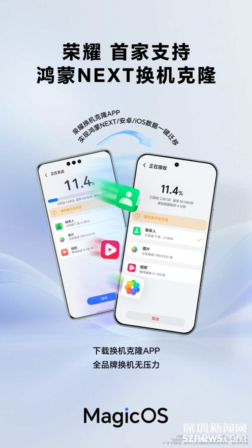 据了解,荣耀“换机克隆”APP支持鸿蒙NEXT迁移,主要基于荣耀互联Nearby设备连接能力和DFTP高速近场传输能力,在用户充分授权下,可快速将用户需要的图片、视频、联系人等数据传输到荣耀设备,并转换成MagicOS格式,方便用户用机。