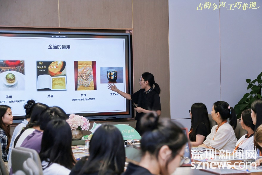 活动伊始,罗丹老师以其深厚的专业素养与亲切细致的讲解,带领大家深入了解金箔画这项千年古技。她介绍道,金箔技艺源于东晋,盛于南朝,南京作为中国金箔的发源地,其传统锻制工艺已有1700余年历史,并于2006年被列入国家级非物质文化遗产名录。金箔画不仅是传统工艺的代表,更蕴含着中华民族对吉祥、美好生活的期许。