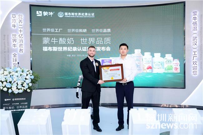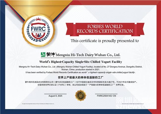 深圳新闻网2025年8月11日讯(记者 董非)8月8日,以“蒙牛酸奶 世界品质”为主题的FWRC福布斯世界纪录认证新闻发布会在蒙牛高科乳制品武汉有限责任公司(以下简称“蒙牛低温武汉工厂”)举行。