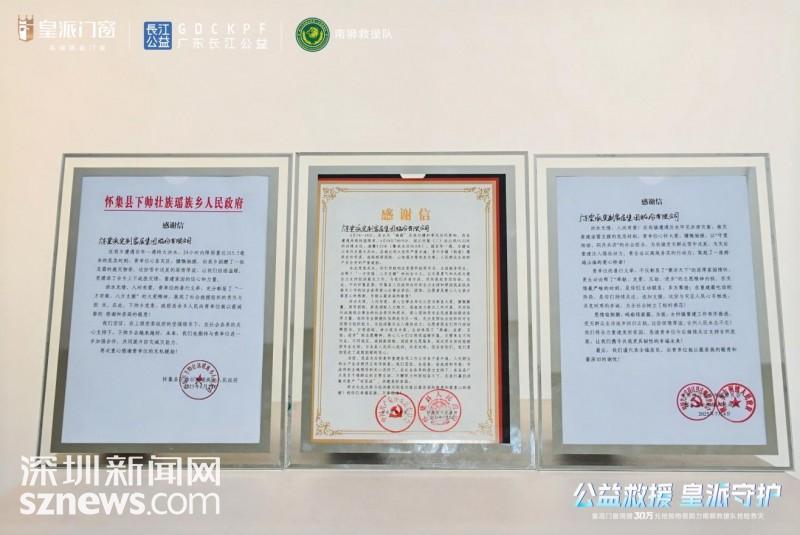 现场更迎来两份来自远方的温暖回响——贵州榕江县与肇庆怀集县政府的感谢状。这两份跨越山海的谢意,铭记了在今年六月特大洪水灾害中,皇派门窗与长江公益基金会火速调集应急物资,全力支持南狮救援队星夜驰援、英勇奋战的担当与大爱。谢新召副局长更代表佛山市退役军人事务局,向皇派门窗现场颁发了表扬信,再次高度肯定其在榕江抗洪救灾中的突出贡献和家国情怀。