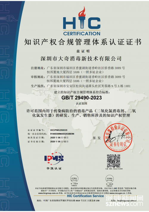 深圳新闻网2025年8月15日讯(记者 董非 通讯员 吴雨芯 陈佩贤)八月中旬,在国内消毒制品研发生产销售领军企业的深圳市大奇消毒新技术有限公司,荣获了广东省知识产权体系合规认证,使企业在知识产权支撑实体经济高质量发展中,增加了合规性的保障。
