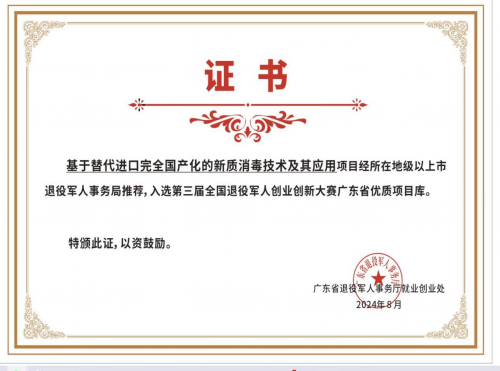 作为中小企业的深圳市大奇消毒新技术有限公司,已经在全国消毒产业领域内,技术创新做到了领先示范;其发明专利技术“免活化二氧化氯”,不仅被写入国家消毒GB/T26366标准中,而且被选定为国家标准制定中的标准品;仅对单一的“免活化二氧化氯”消毒技术,就取得了国家授权的发明创造专利28项,形成了“技术创新”知识产权的闭环保护;其“免活化二氧化氯”技术下自主研发、自主生产、自主销售的大奇安部牌二氧化氯消毒液、气体发生器、液体发生器,不仅是作为国家一类消毒产品与器械获得了政府卫生监督的行政许可备案,而且许可备案应用范围均是高精尖的领域,包括粮食消毒、皮肤消毒、瓜果蔬菜消毒、医疗器械消毒、空气消毒等领域使用;使企业在“技术创新”的赛道上,稳健发展;大奇消毒“免活化二氧化氯”技术项目,2024年获得市级省级全国级创新创业大赛,均获得前三奖次,2025年获得入库深圳鲲鹏青年创新创业项目智库。