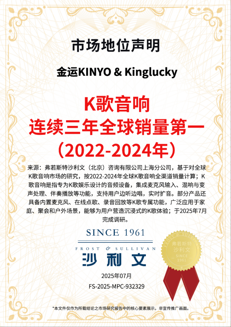 深圳新闻网2025年8月20日讯(记者 董非)2025年7月,金运KINYO品牌凭借在智能音频领域的卓越表现,再度荣获国际知名市场研究机构弗若斯特沙利文(Frost & Sullivan)的权威背书——“2022-2024年连续三年全球K歌音响销量第一”的市场地位声明。这是继去年获得“2023年全球大众价位开放式耳机销量第一”之后,金运品牌再次摘得的全球性认证。