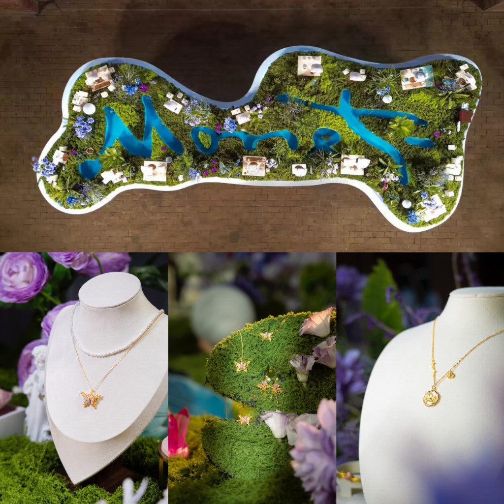 与此同时,本次在云南弥勒万花筒艺术馆的展览设计中,周大生匠心独运地打造三大主题展区,构建沉浸式珠宝艺术体验空间。"国家宝藏"展区以东方美学为基调,运用松、竹、木等传统花艺元素,打造出极具中式雅韵的陈列空间。珠宝在苍翠间若隐若现,彰显非遗云锦工艺与现代金工技艺的完美融合。