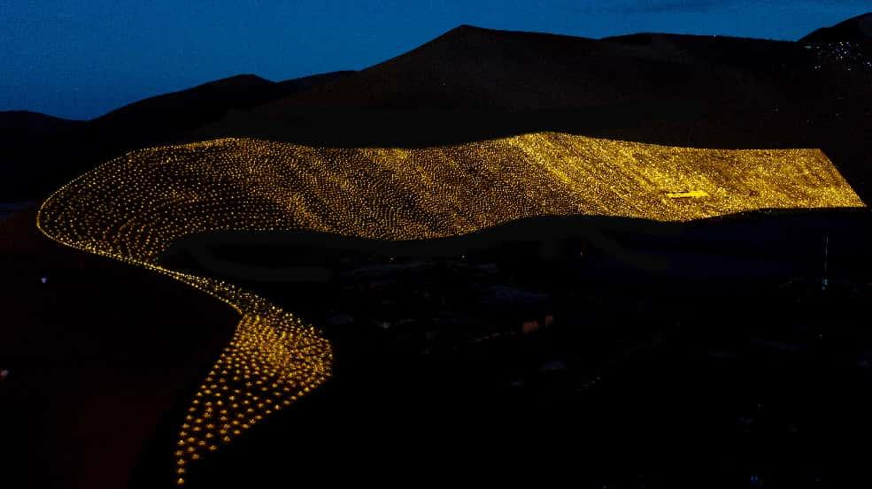 8月28日当天,唐师傅带头顶着烈日,拿着大喇叭指挥工人们用细微的改进实现更高效率的协作,年过五十的唐师傅穿越陡峭沙山的动作,比大多数年轻人还要利落。“太阳能灯的核心是‘靠天吃饭’,但人的努力能让‘天’更帮忙。”他的话让队员们重新振作,有人为校准灯阵造型在沙中来回丈量,有人为节省体力趴在沙地上手脚并用,汗水浸透衣衫也无人停歇。最终,在认证开始前几小时,36862只太阳能灯全部布置到位,灯阵中颖朗的巨幅品牌logo与沙山的金黄光晕相映成趣。
