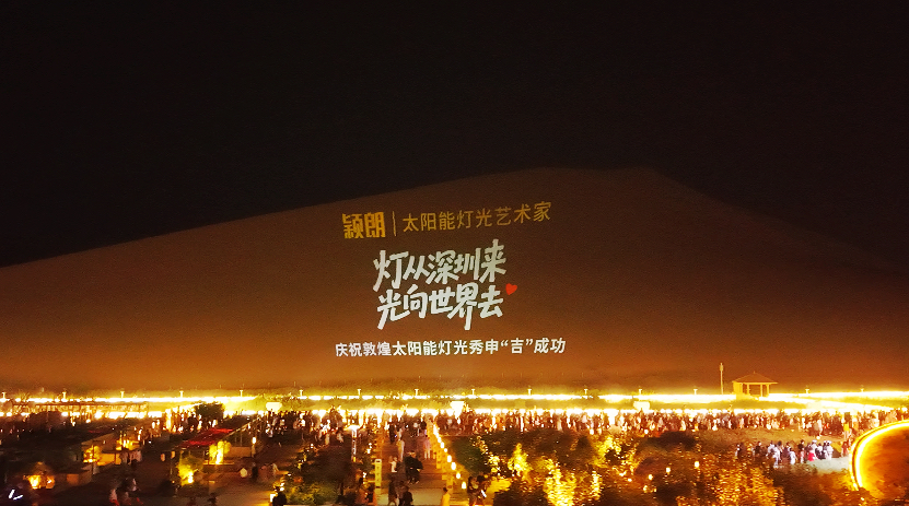 这场跨越2000公里的灯光之约,既是深圳与敦煌的双向奔赴,更是唐师傅与颖朗团队“追光之路”的生动缩影。8月28日晚,鸣沙山月牙泉景区领导在茫茫人海中找到唐师傅:“敦煌市委领导看到了深圳颖朗团队在灯光秀活动的出色表现,看到久违企业家精神,深深感动,也了解到颖朗之前持续奔赴敦煌、为3800名敦煌小朋友上太阳能科普课、赞助敦煌新年音乐会、在敦煌大剧院广场用8000只太阳能灯光秀祝福世界和平的事迹,决定在布灯位置对面的沙屏上免费为颖朗做宣传”。于是8月29日晚上,这张巨幅的“灯从深圳来,光向世界去”投影,让更多人看见了颖朗。“敦煌落日与太阳能灯光交相辉映之美,深圳与敦煌双向奔赴的美好情感,美美与共,很幸福,很感动!”唐师傅站在颖朗之光里,动情地说。