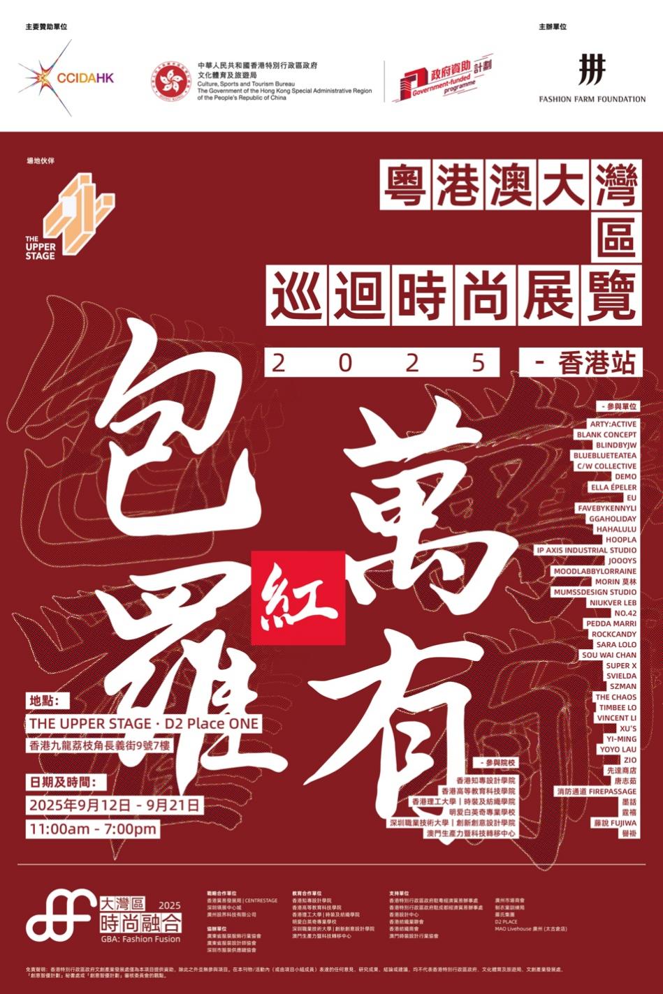 “大湾区:时尚融合 2025”项目的另一重磅活动“粤港澳大湾区巡回时尚展览 2025”,上半年在广州站及深圳站展出后均收获极佳的业内口碑,香港站将于9月12日登场。巡展集合了来自大湾区不同城市的40个时装设计品牌及艺术单位,以及大湾区内6所设计院校,一共展示出108件匠心之作,力图表现湾区多元文化交融下的独特美学与创新力量。巡展延续了去年“包罗万有”的核心精神并进行了升华,今年以“包罗万有 · 红”为主题,寓意“万绿丛中一点红”,聚焦大湾区新锐设计师和院校学生,聚焦时尚设计中最耀眼、最有突破的创意之作。